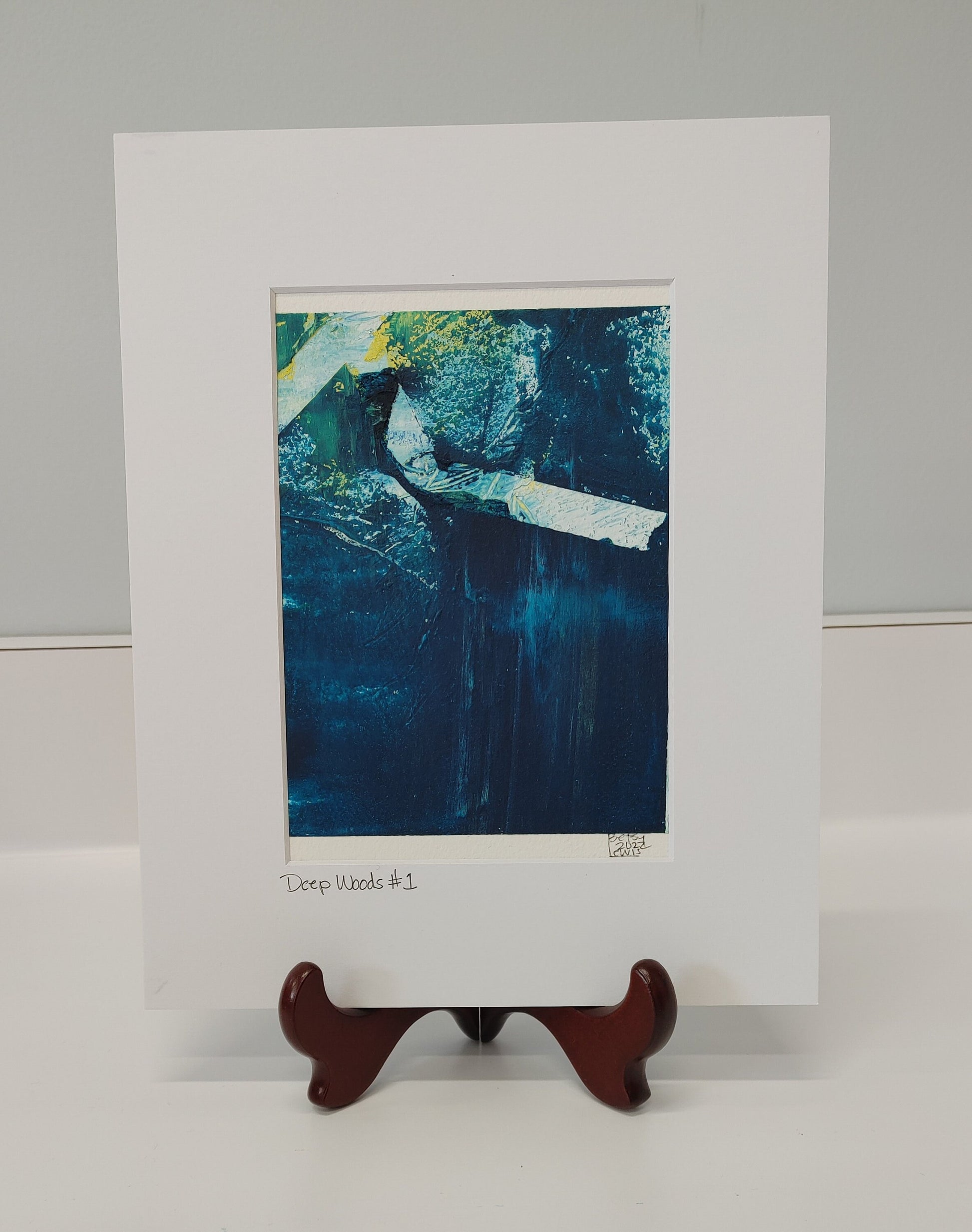 Deep Woods #1 is an original oil and cold wax painting. The painting itself is approximately 5" x 7" but it is matted in a white mat to 8" x 10" making it just right for a traditional frame. The painting has beautiful rich colors and textures.