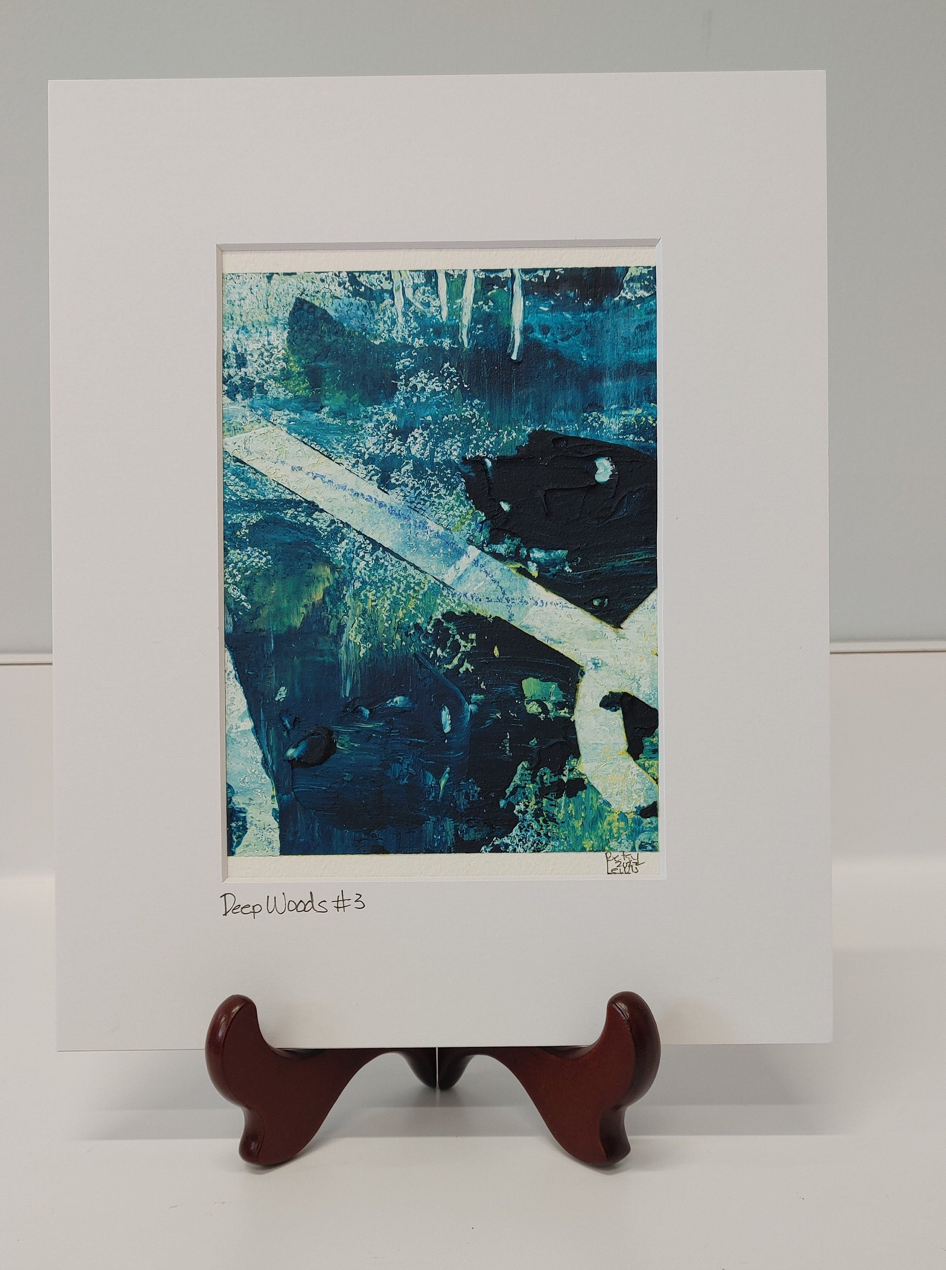 Deep Woods #3 is an original oil and cold wax painting. The painting itself is approximately 5" x 7" but it is matted in a white mat to 8" x 10" making it just right for a traditional frame. The painting has beautiful rich colors and textures.