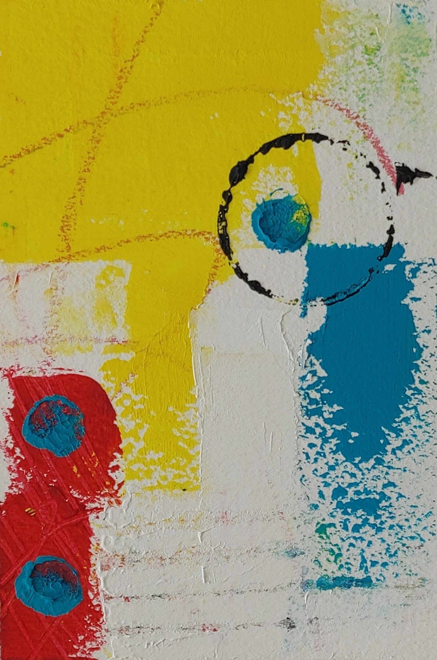 Discus School #1 is an original oil and cold wax painting. The painting itself is approximately 5" x 7" but it is matted in a white mat to 8" x 10" making it just right for a traditional frame. The painting has beautiful rich colors and textures.
