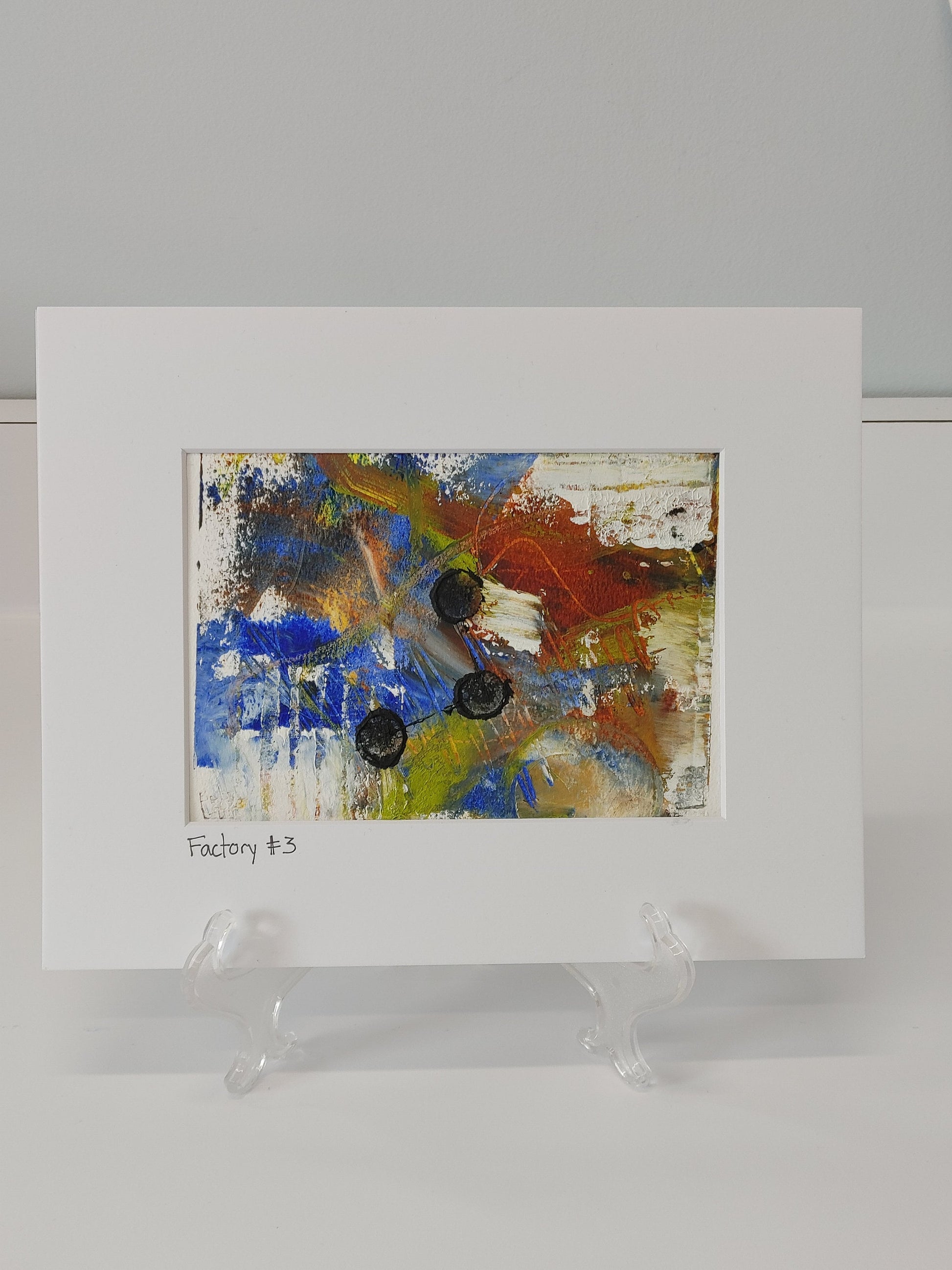 Factory #3 is an original oil and cold wax painting. The painting itself is approximately 5" x 7" but it is matted in a white mat to 8" x 10" making it just right for a traditional frame.  The painting has beautiful rich colors and textures.