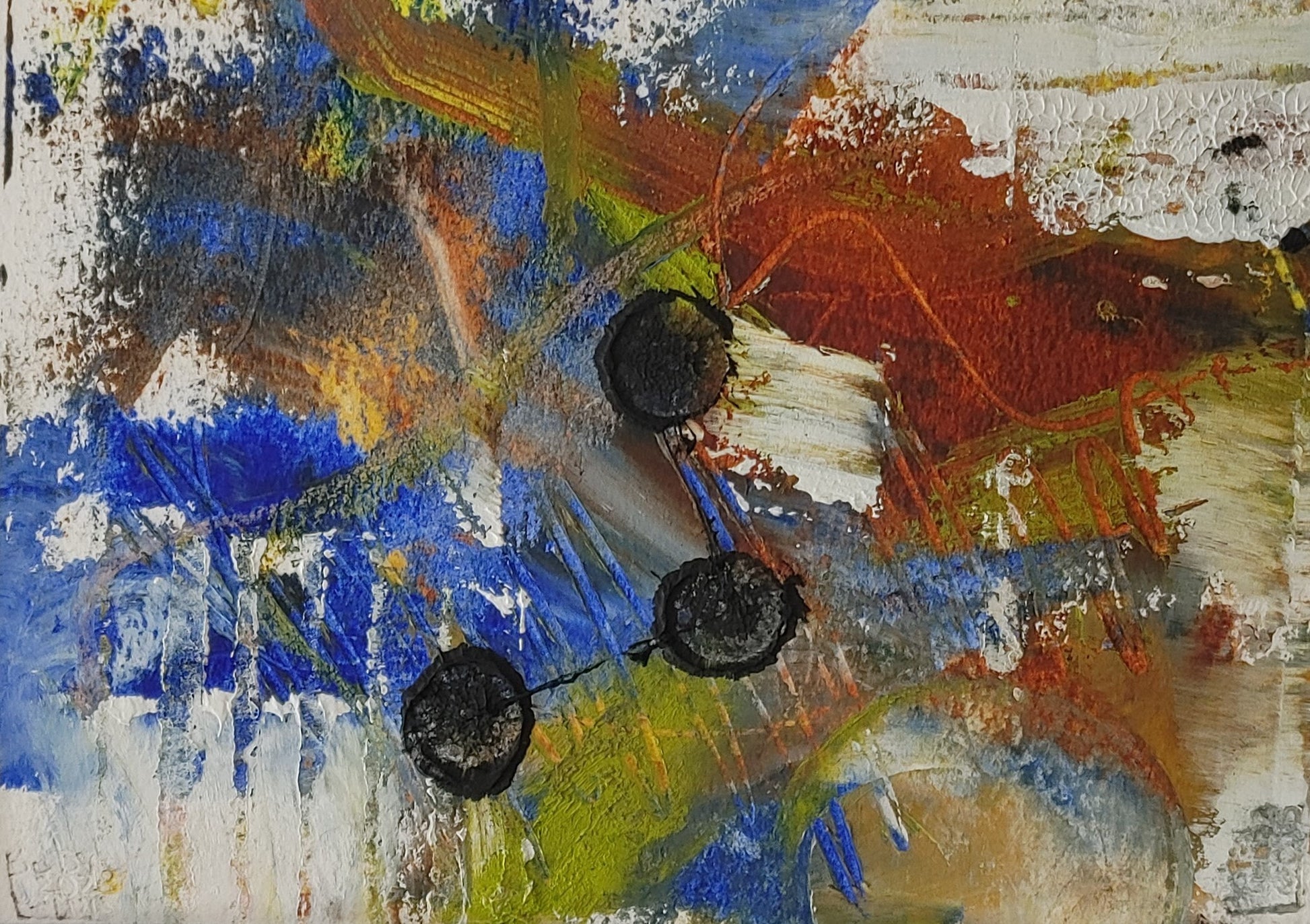 I like to include lots of textures in my paintings. I use several tools in my painting, including squeegees, chop sticks, palette knives, corrugated cardboard and other mark making items.