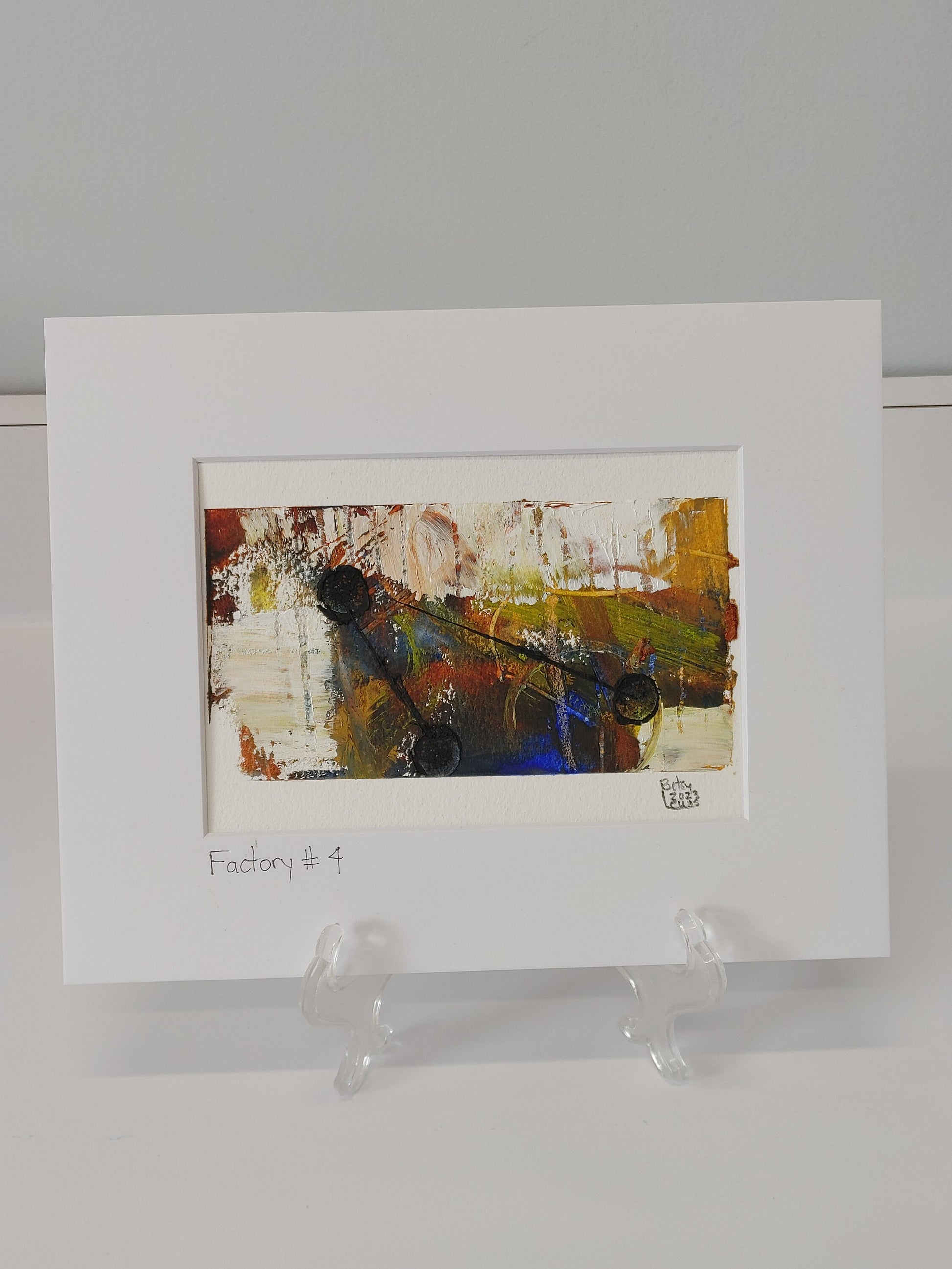 Factory #4 is an original oil and cold wax painting. The painting itself is approximately 5" x 7" but it is matted in a white mat to 8" x 10" making it just right for a traditional frame.  The painting has beautiful rich colors and textures.