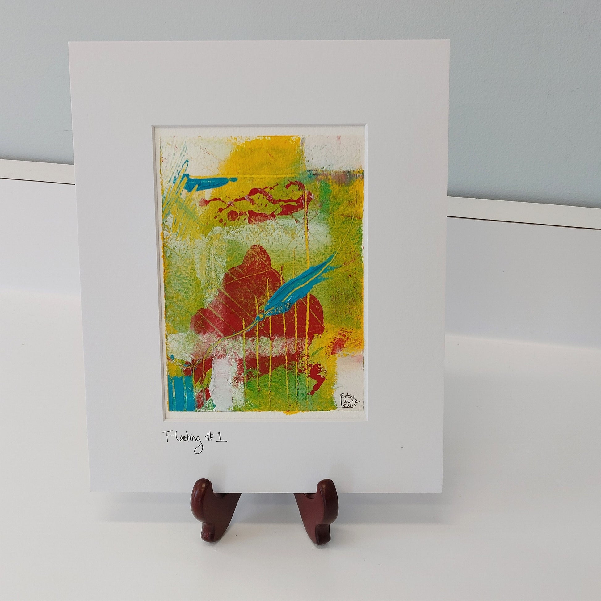 Fleeting #1 is an original oil and cold wax painting. The painting itself is approximately 5" x 7" but it is matted in a white mat to 8" x 10" making it just right for a traditional frame. The painting has beautiful rich colors and textures.