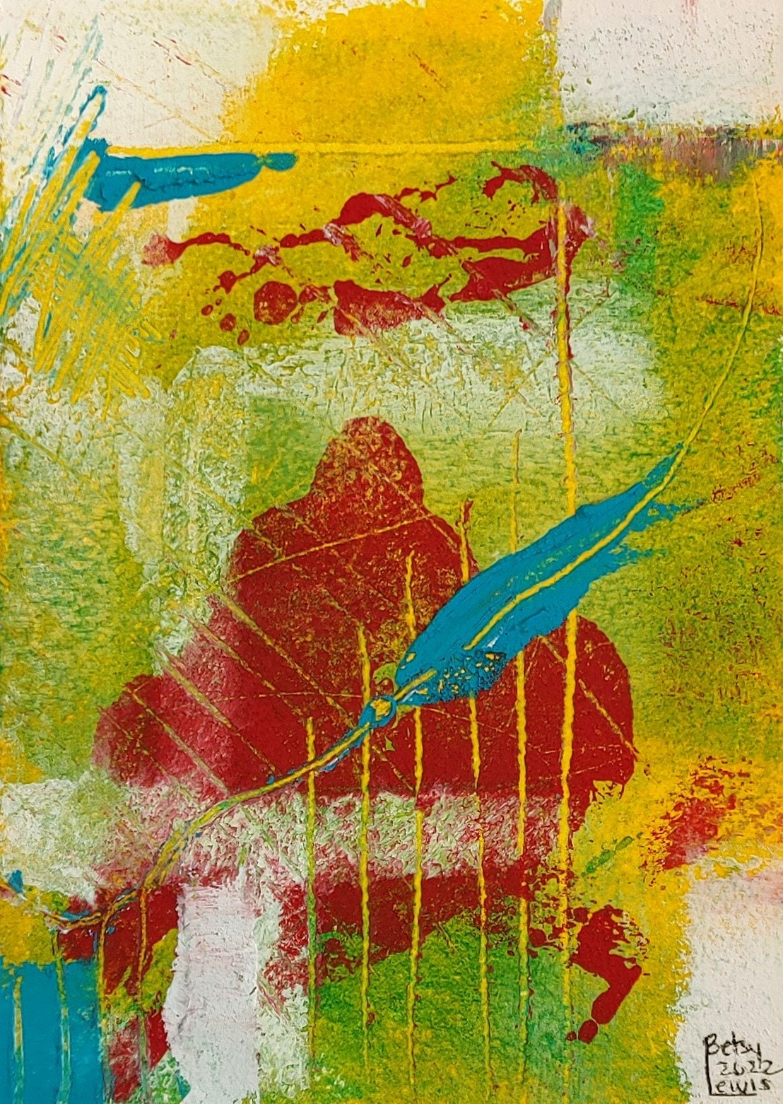 I like to include lots of textures in my paintings. I use several tools in my painting, including squeegees, chop sticks, palette knives, corrugated cardboard and other mark making items.