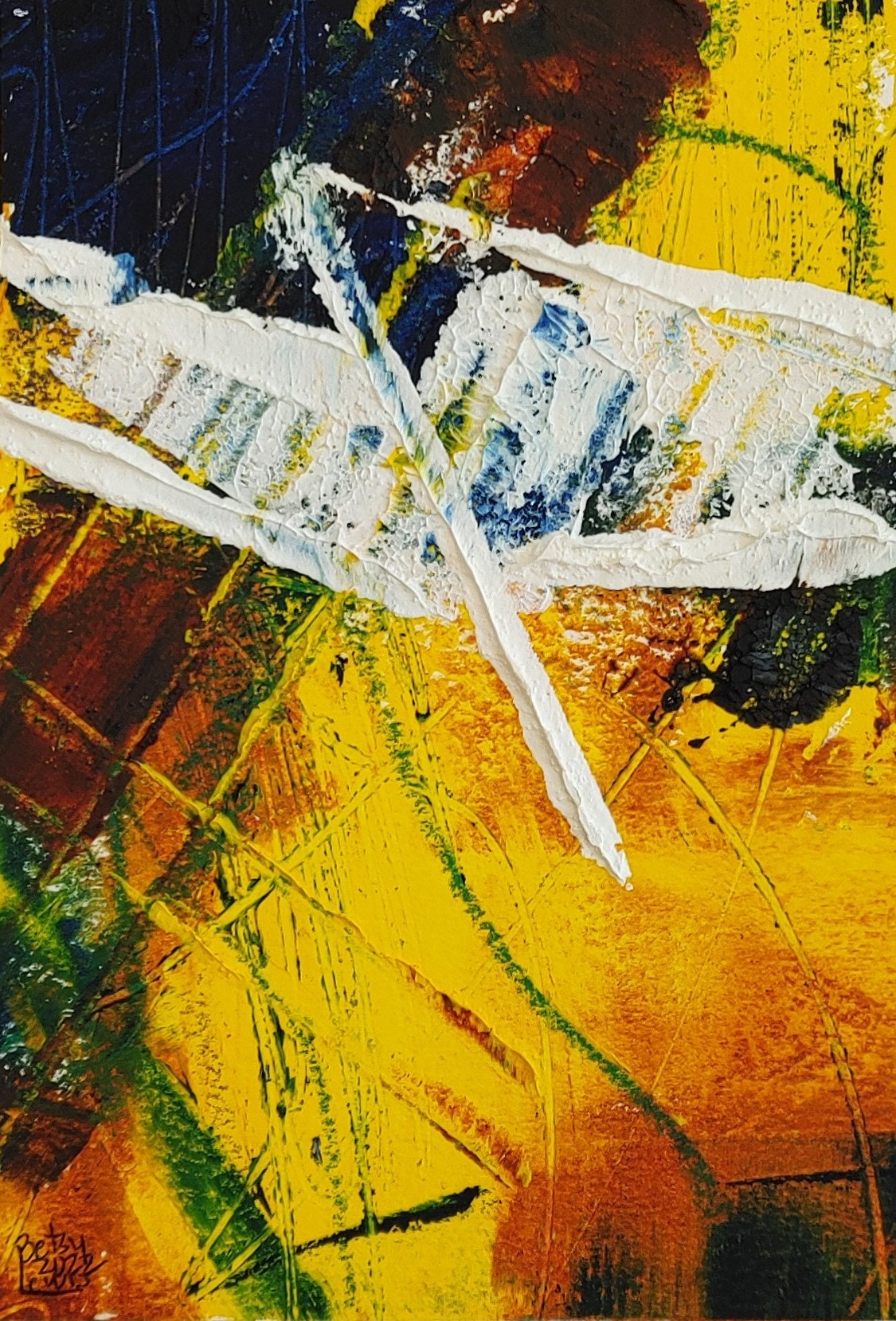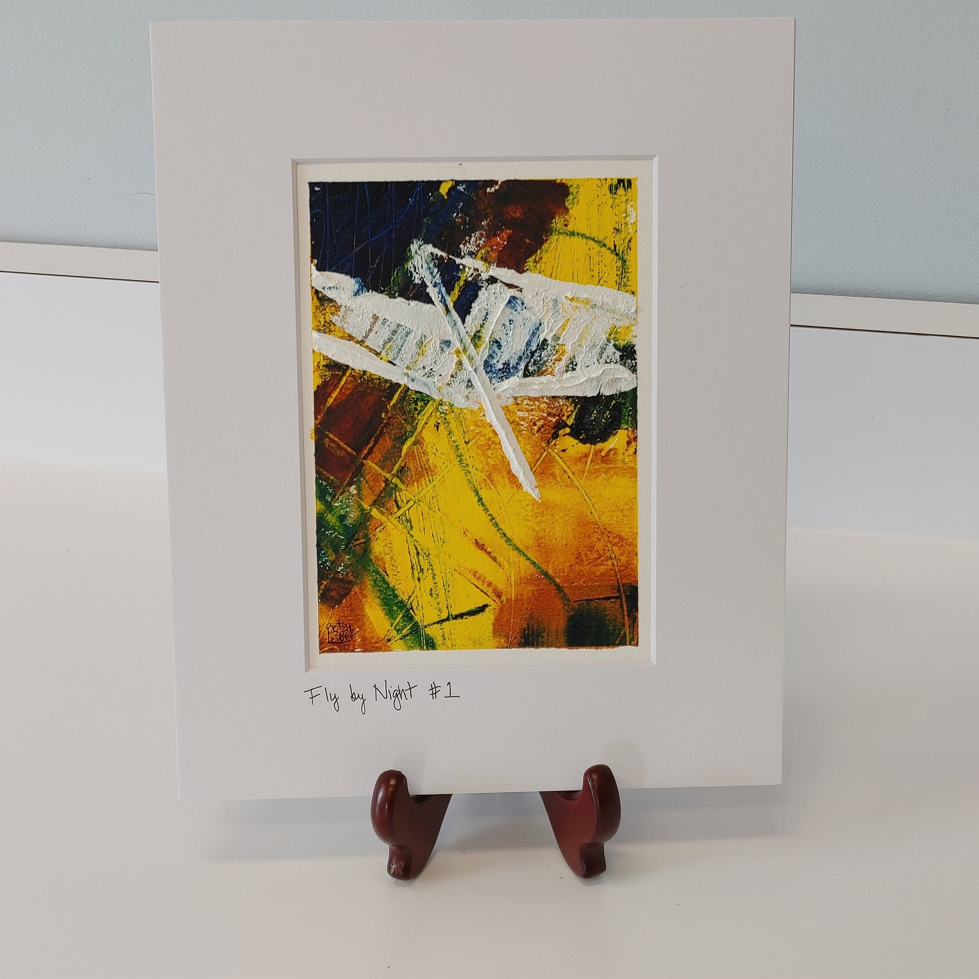 Fly By Night #1 is an original oil and cold wax painting. The painting itself is approximately 5" x 7" but it is matted in a white mat to 8" x 10" making it just right for a traditional frame. The painting has beautiful rich colors and textures.