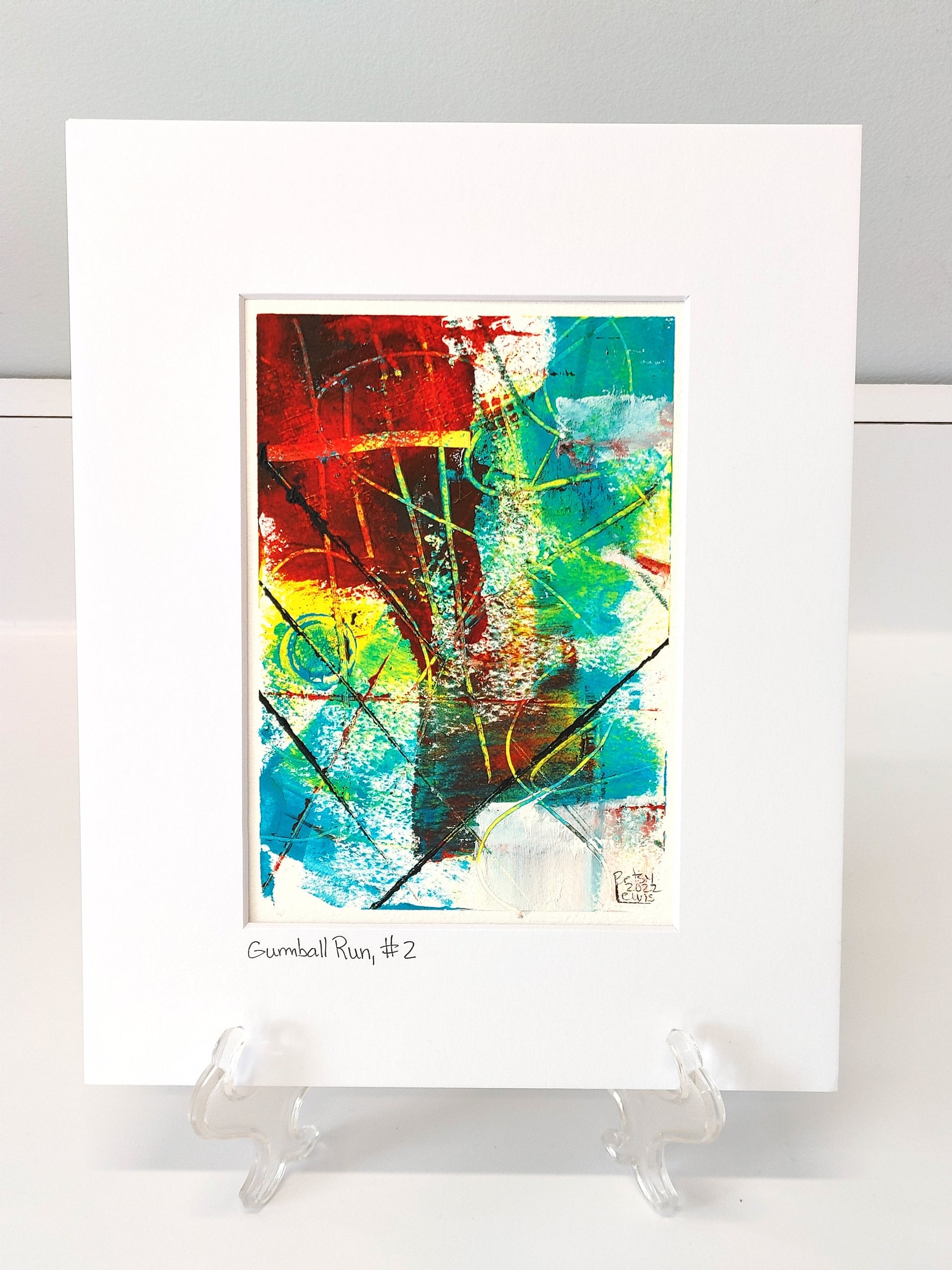 Gumball Run #2 is an original oil and cold wax painting. The painting itself is approximately 5" x 7" but it is matted in a white mat to 8" x 10" making it just right for a traditional frame. The painting has beautiful rich colors and textures.