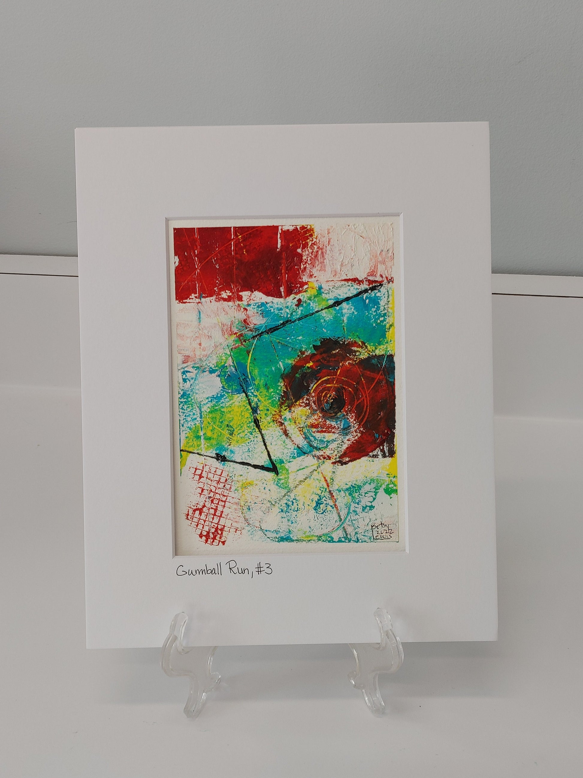 Gumball Run #3 is an original oil and cold wax painting. The painting itself is approximately 5" x 7" but it is matted in a white mat to 8" x 10" making it just right for a traditional frame. The painting has beautiful rich colors and textures.