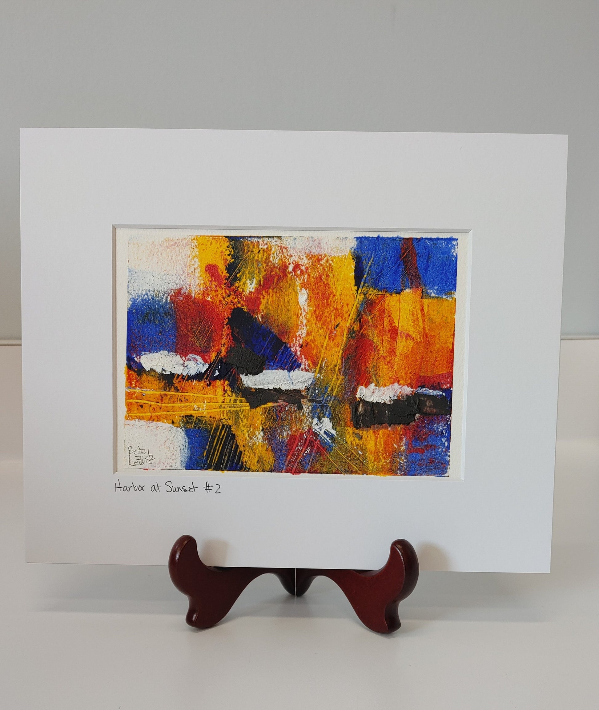 Harbor At Sunset #2 is an original oil and cold wax painting. The painting itself is approximately 5" x 7" but it is matted in a white mat to 8" x 10" making it just right for a traditional frame. The painting has beautiful rich colors and textures.