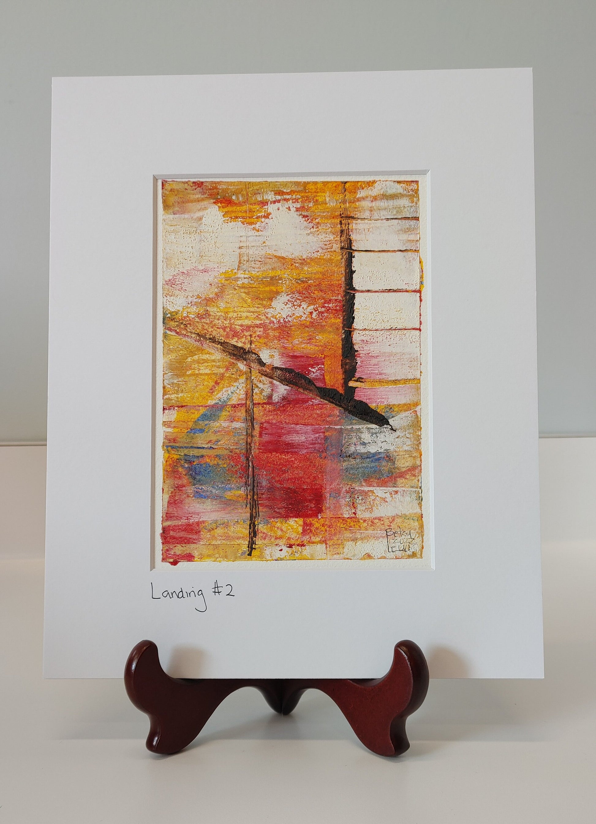 Landing #2 is an original oil and cold wax painting. The painting itself is approximately 5" x 7" but it is matted in a white mat to 8" x 10" making it just right for a traditional frame. The painting has beautiful rich colors and textures.
