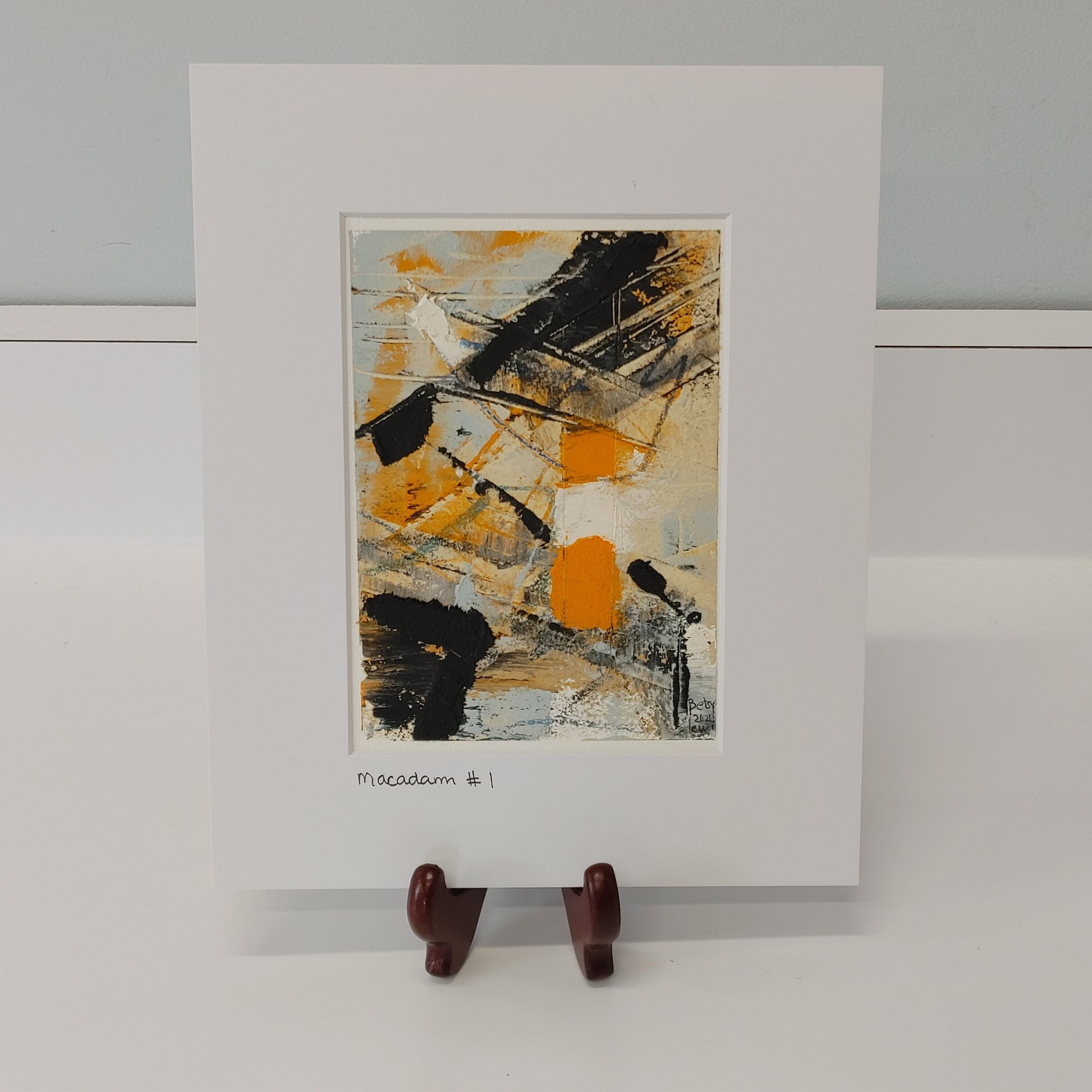 Macadam #1 is an original oil and cold wax painting. The painting itself is approximately 5" x 7" but it is matted in a white mat to 8" x 10" making it just right for a traditional frame. The painting has beautiful rich colors and textures.