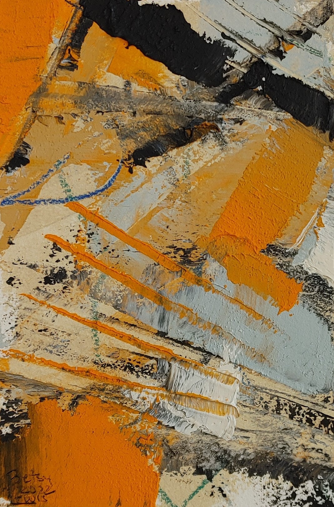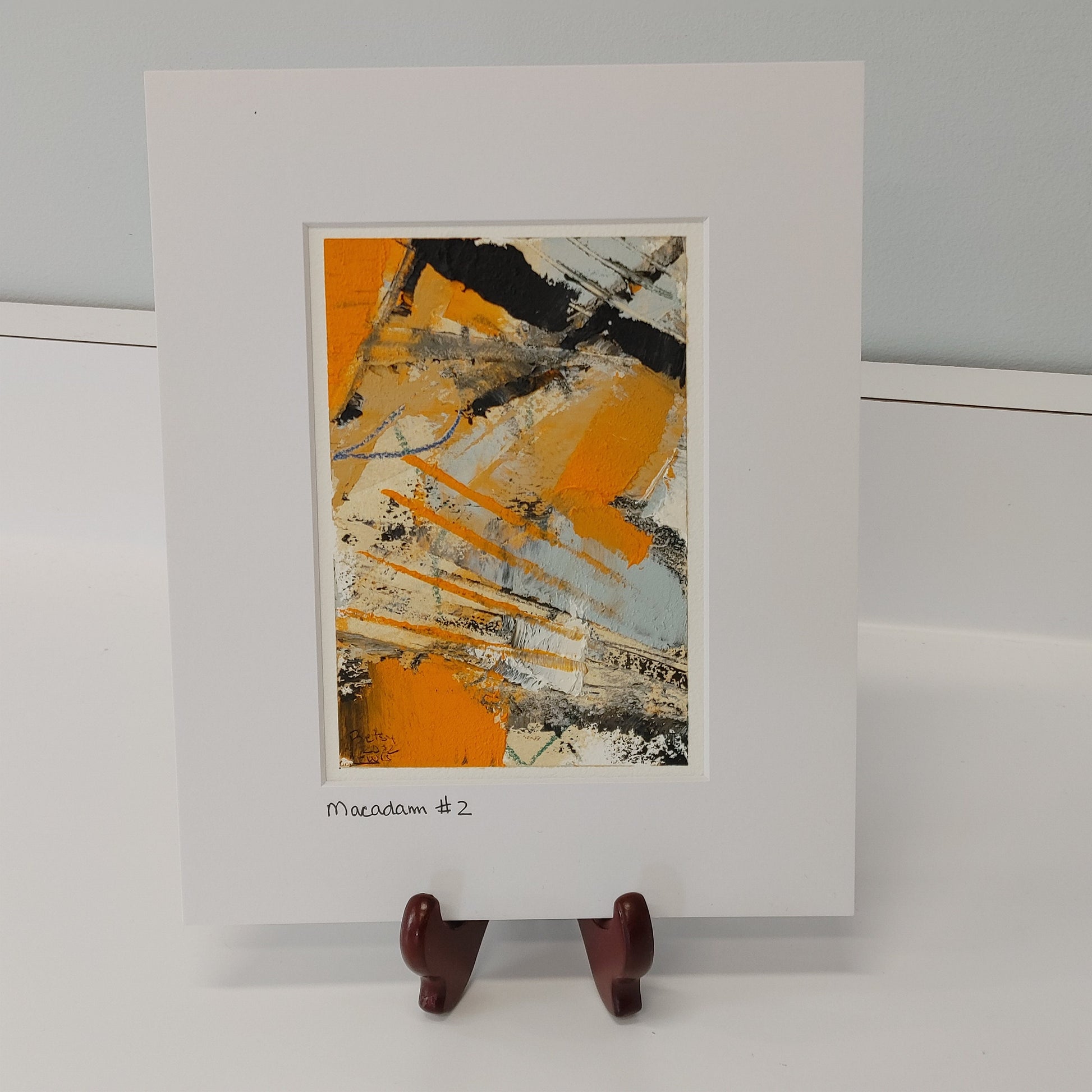 Macadam #2 is an original oil and cold wax painting. The painting itself is approximately 5" x 7" but it is matted in a white mat to 8" x 10" making it just right for a traditional frame. The painting has beautiful rich colors and textures.