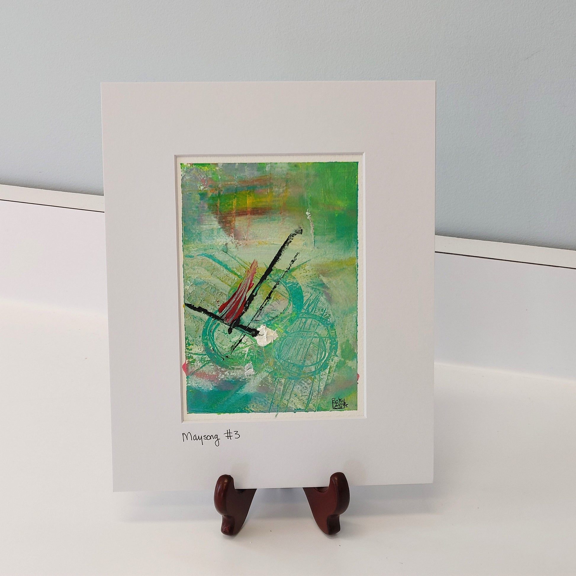 Maysong #3 is an original oil and cold wax painting. The painting itself is approximately 5" x 7" but it is matted in a white mat to 8" x 10" making it just right for a traditional frame. The painting has beautiful rich colors and textures.