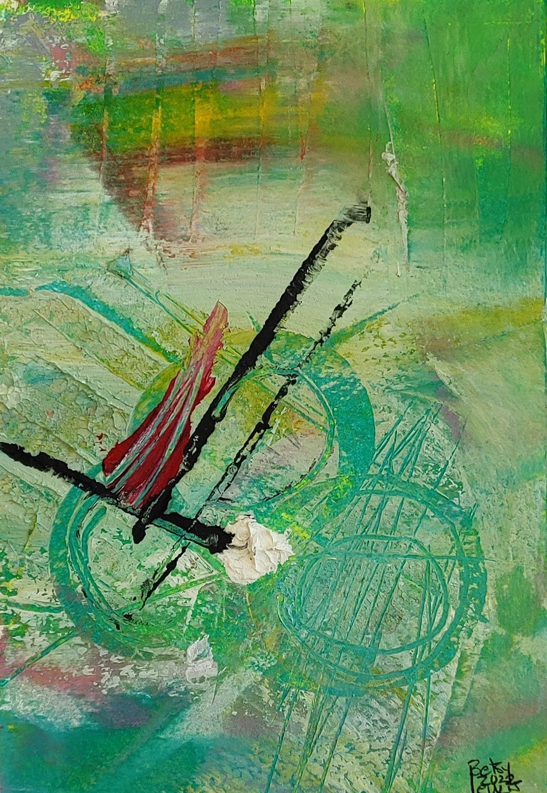 I like to include lots of textures in my paintings. I use several tools in my painting, including squeegees, chop sticks, palette knives, corrugated cardboard and other mark making items.
