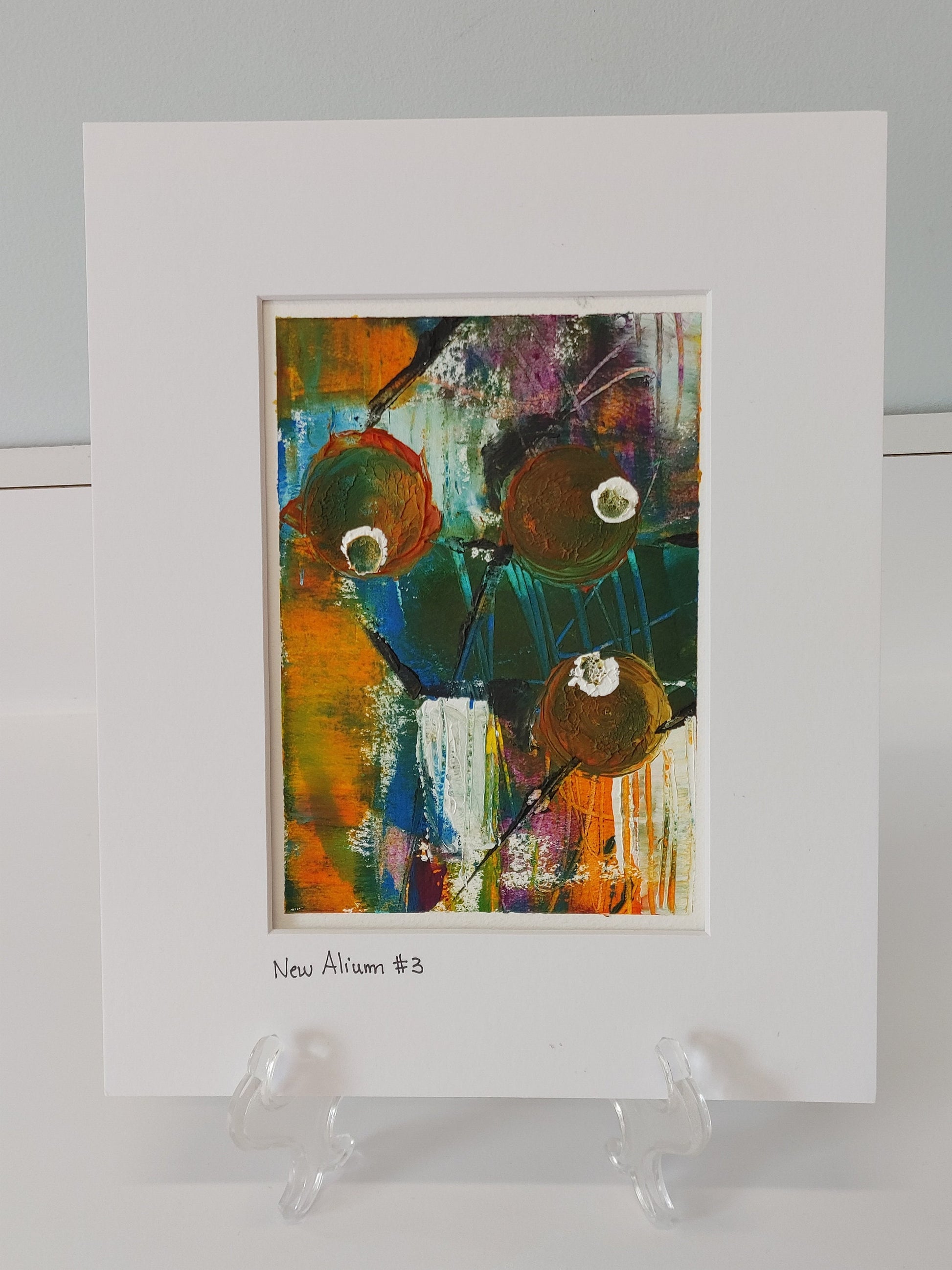 New Allium #3 is an original oil and cold wax painting. The painting itself is approximately 5" x 7" but it is matted in a white mat to 8" x 10" making it just right for a traditional frame. The painting has beautiful rich colors and textures.