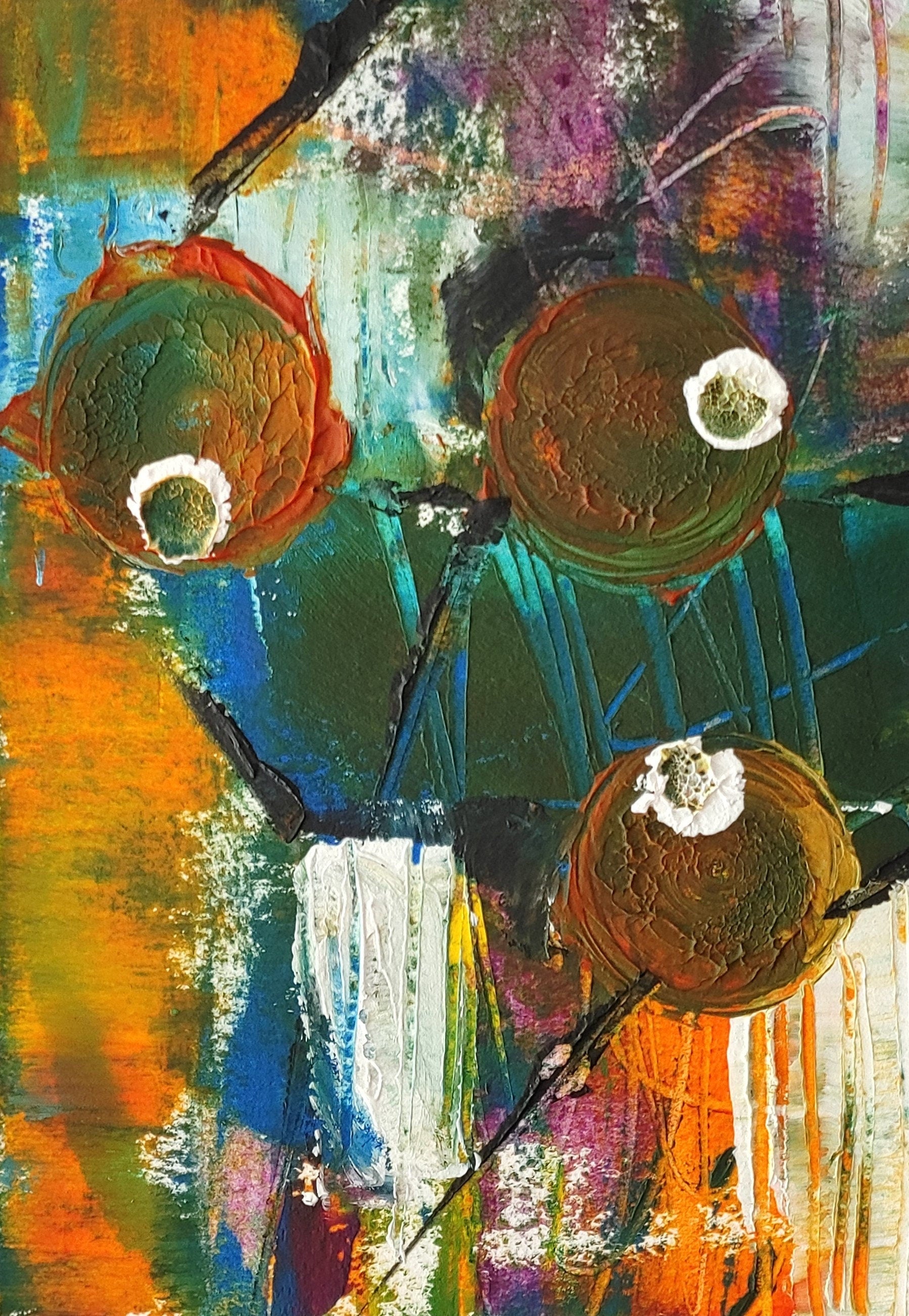 I like to include lots of textures in my paintings. I use several tools in my painting, including squeegees, chop sticks, palette knives, corrugated cardboard and other mark making items.