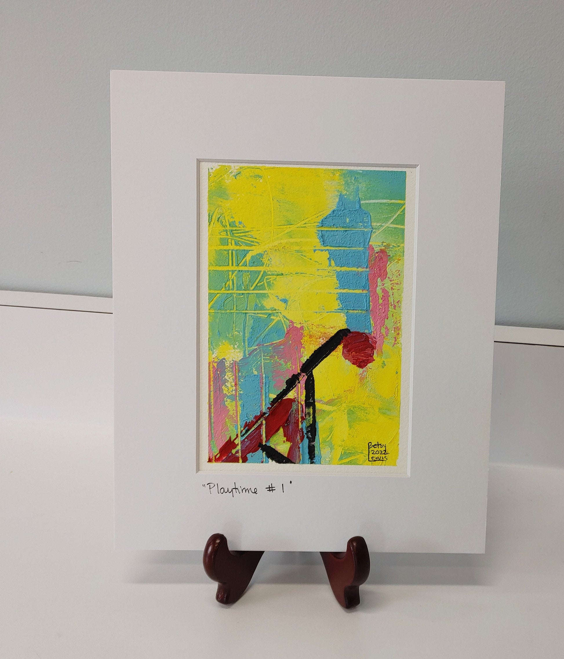 Playtime #1 is an original oil and cold wax painting. The painting itself is approximately 5" x 7" but it is matted in a white mat to 8" x 10" making it just right for a traditional frame. The painting has beautiful rich colors and textures.