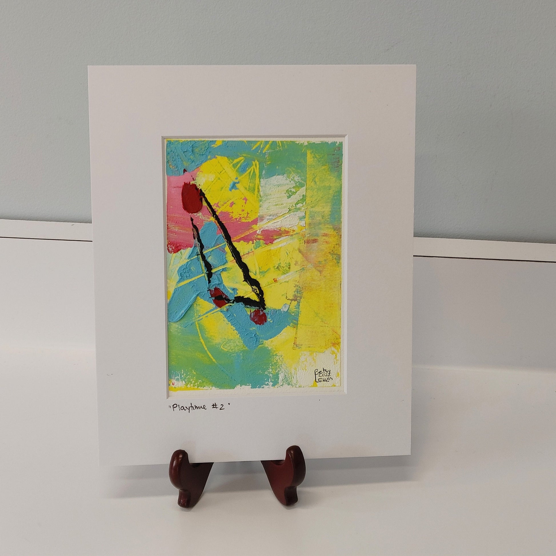 Playtime #2 is an original oil and cold wax painting. The painting itself is approximately 5" x 7" but it is matted in a white mat to 8" x 10" making it just right for a traditional frame. The painting has beautiful rich colors and textures.