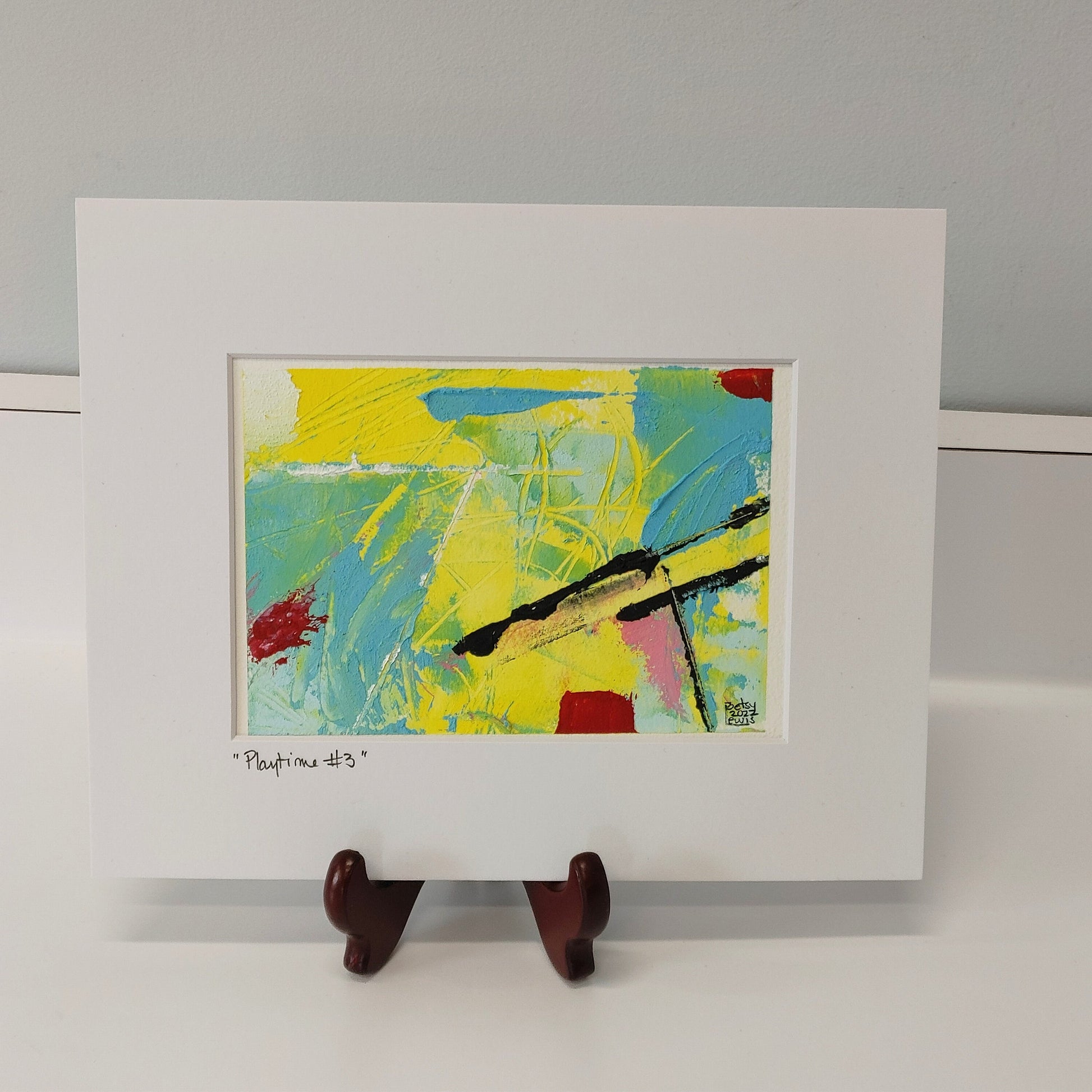 Playtime #3 is an original oil and cold wax painting. The painting itself is approximately 5" x 7" but it is matted in a white mat to 8" x 10" making it just right for a traditional frame. The painting has beautiful rich colors and textures.
