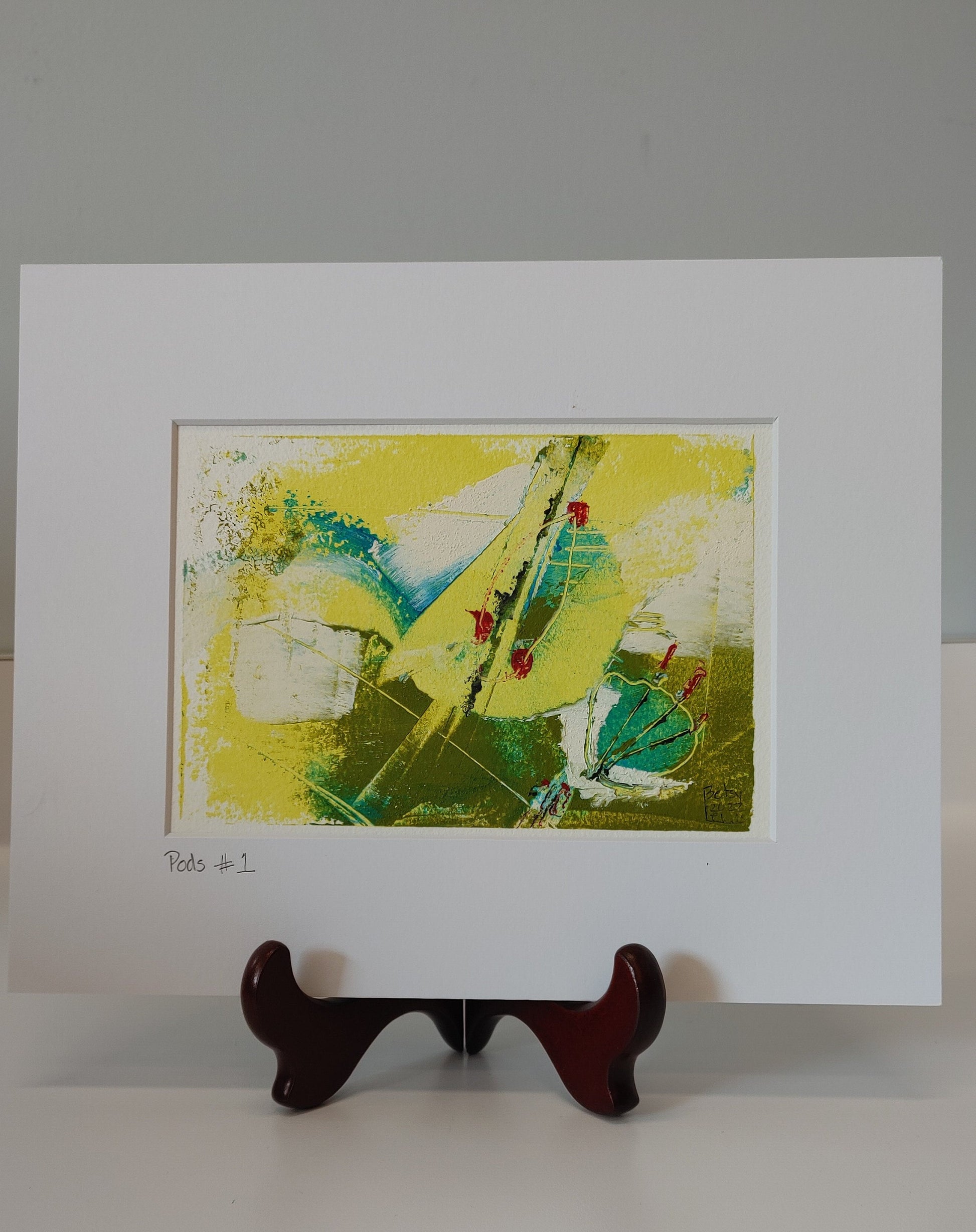 Pods #1 is an original oil and cold wax painting. The painting itself is approximately 5" x 7" but it is matted in a white mat to 8" x 10" making it just right for a traditional frame. The painting has beautiful rich colors and textures.