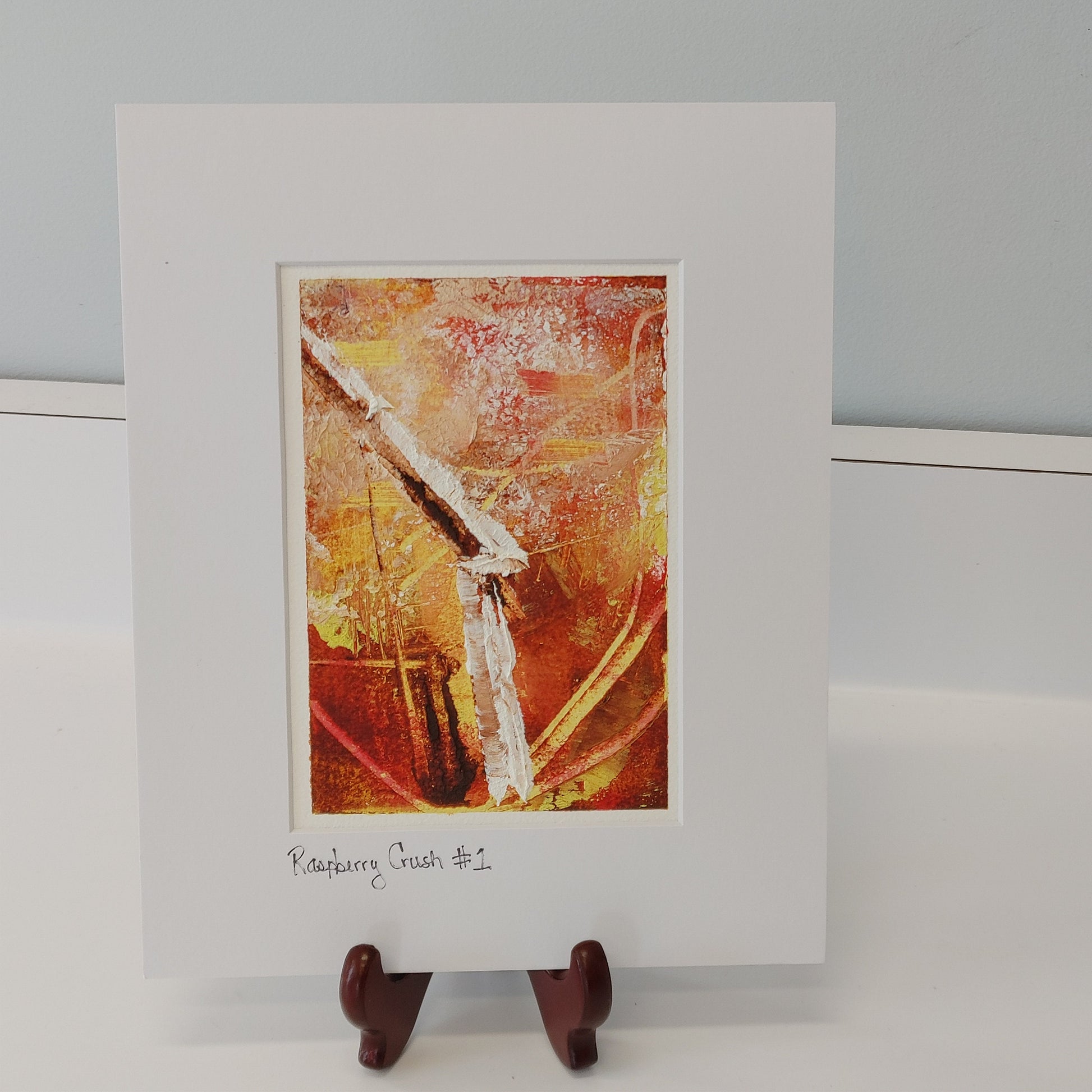Raspberry Crush #1 is an original oil and cold wax painting. The painting itself is approximately 5" x 7" but it is matted in a white mat to 8" x 10" making it just right for a traditional frame. The painting has beautiful rich colors and textures.