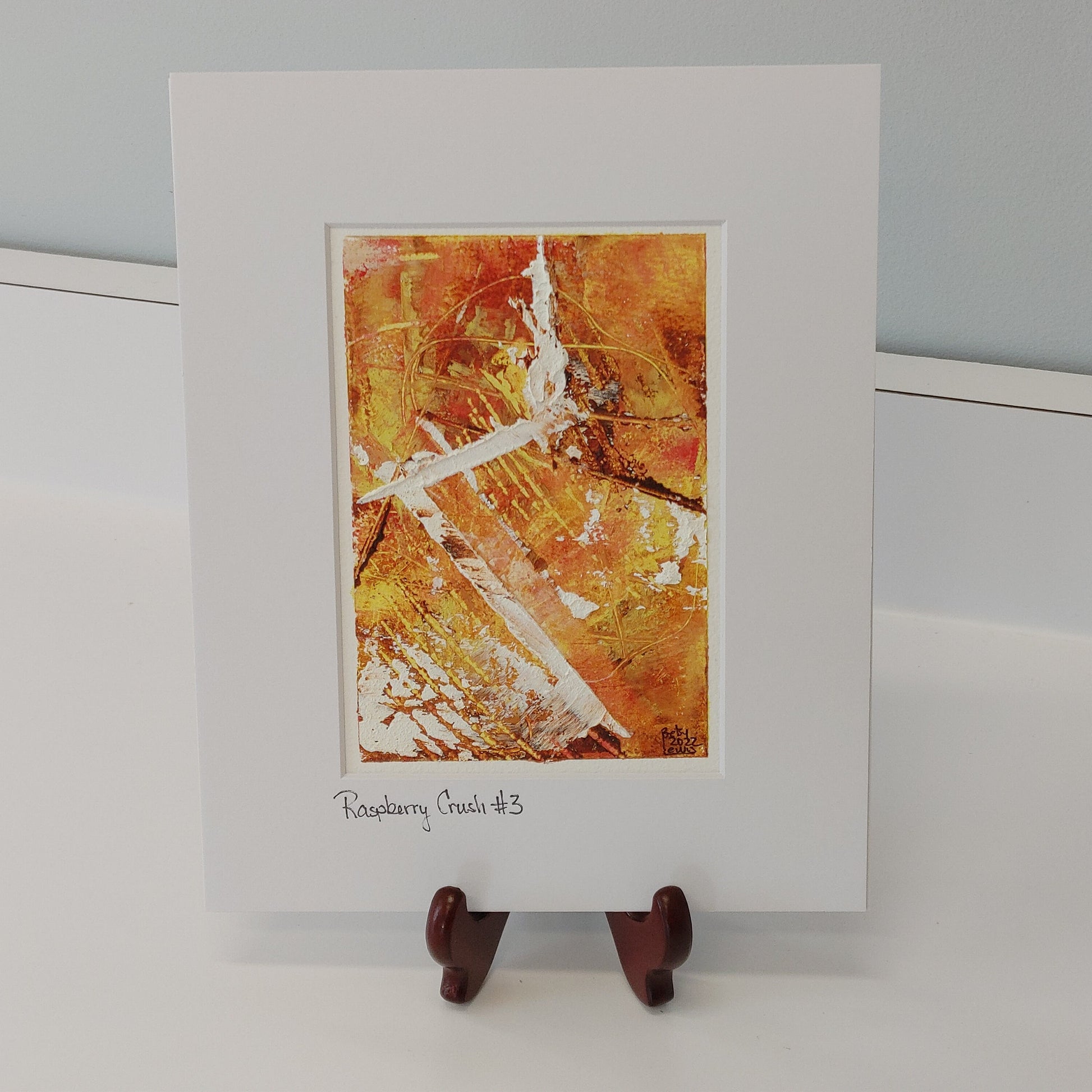 Raspberry Crush #3 is an original oil and cold wax painting. The painting itself is approximately 5" x 7" but it is matted in a white mat to 8" x 10" making it just right for a traditional frame. The painting has beautiful rich colors and textures.