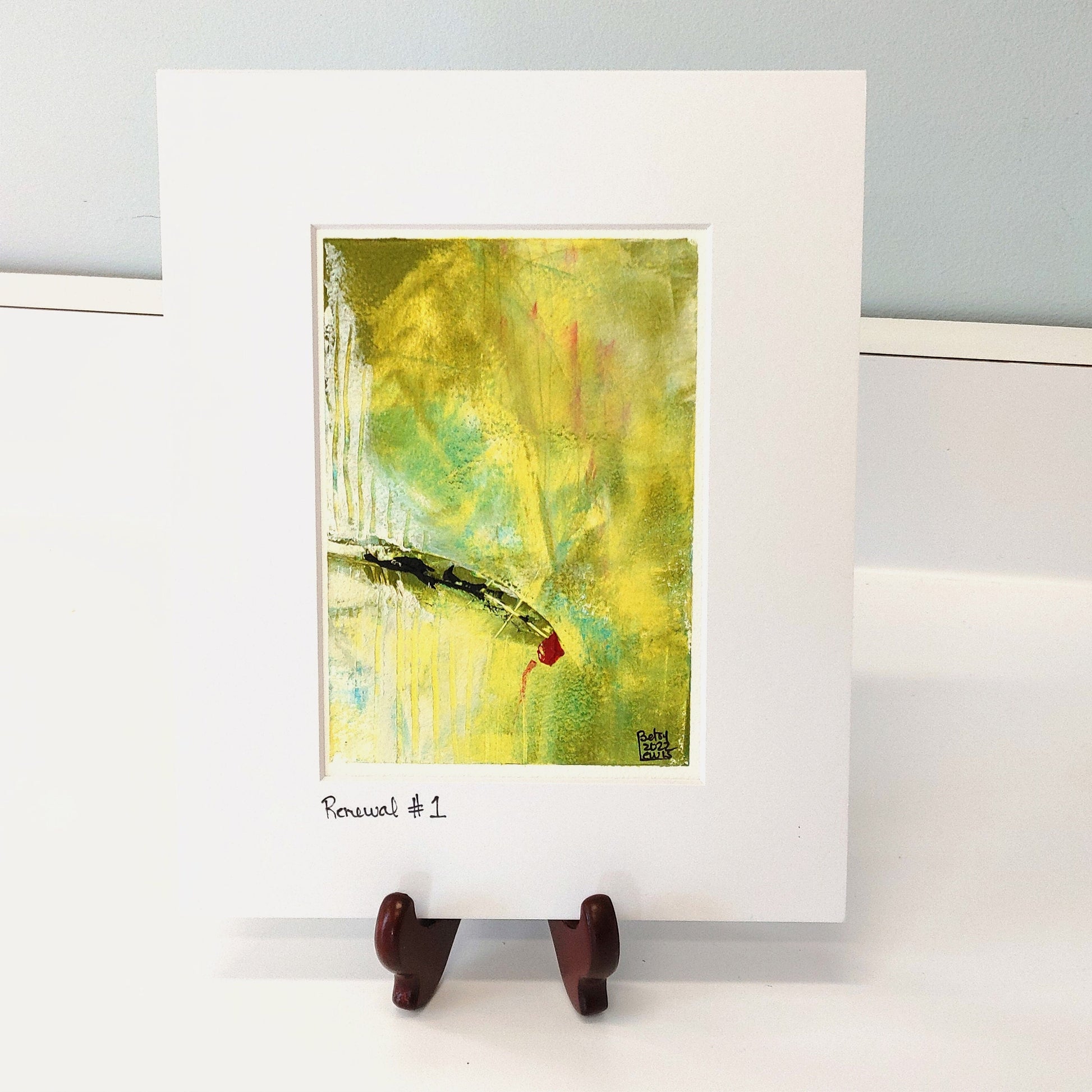 Renewal #1 is an original oil and cold wax painting. The painting itself is approximately 5" x 7" but it is matted in a white mat to 8" x 10" making it just right for a traditional frame. The painting has beautiful rich colors and textures.
