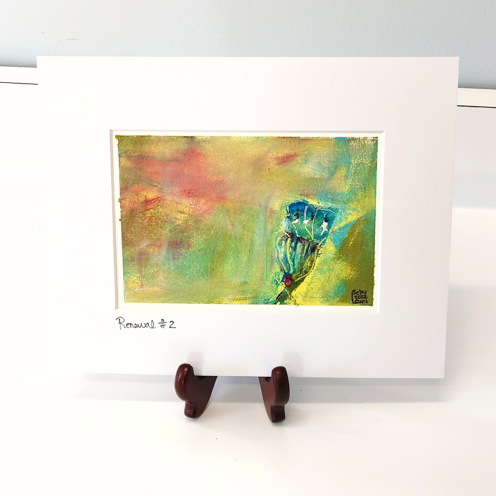 Renewal #2 is an original oil and cold wax painting. The painting itself is approximately 5" x 7" but it is matted in a white mat to 8" x 10" making it just right for a traditional frame. The painting has beautiful rich colors and textures.