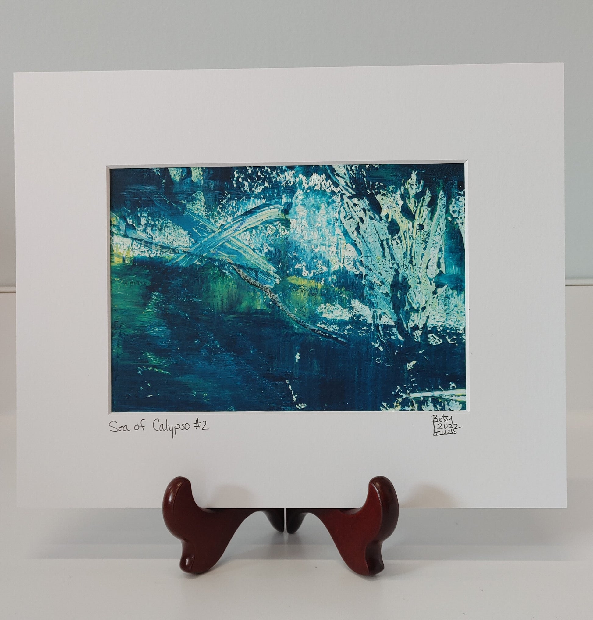 Sea of Calypso #2 is an original oil and cold wax painting. The painting itself is approximately 5" x 7" but it is matted in a white mat to 8" x 10" making it just right for a traditional frame. The painting has beautiful rich colors and textures.