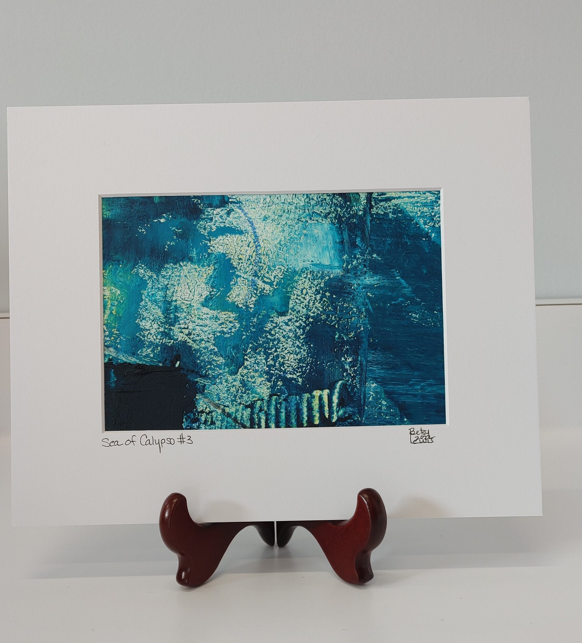Sea of Calypso #3 is an original oil and cold wax painting. The painting itself is approximately 5" x 7" but it is matted in a white mat to 8" x 10" making it just right for a traditional frame. The painting has beautiful rich colors and textures.