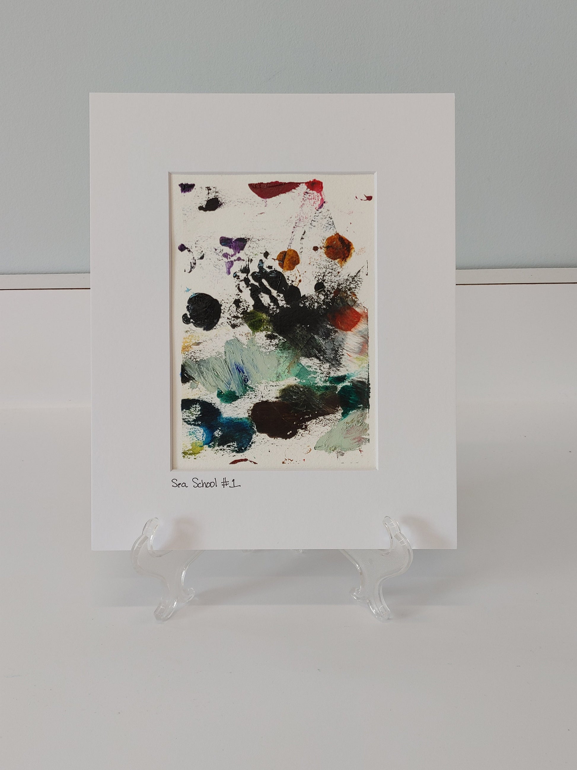 Sea School #1 is an original oil and cold wax painting. The painting itself is approximately 5" x 7" but it is matted in a white mat to 8" x 10" making it just right for a traditional frame. The painting has beautiful rich colors and textures.