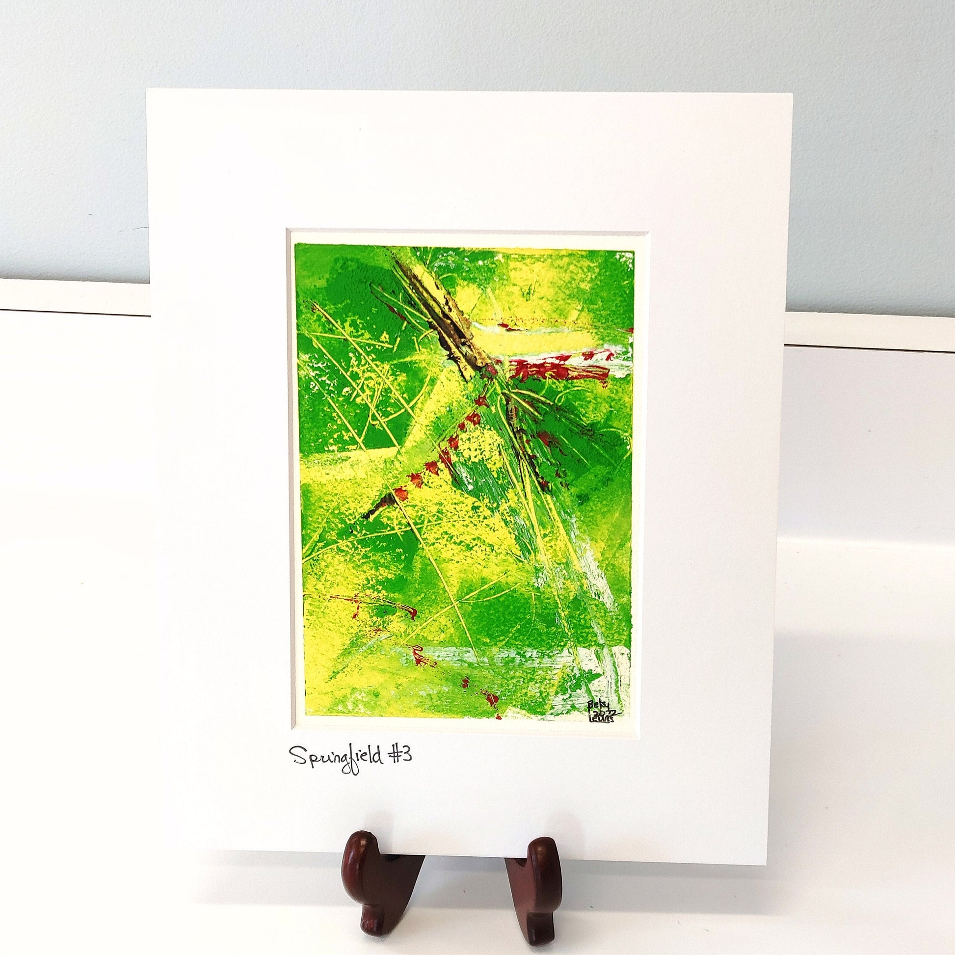 Springfield #3 is an original oil and cold wax painting. The painting itself is approximately 5" x 7" but it is matted in a white mat to 8" x 10" making it just right for a traditional frame. The painting has beautiful rich colors and textures.
