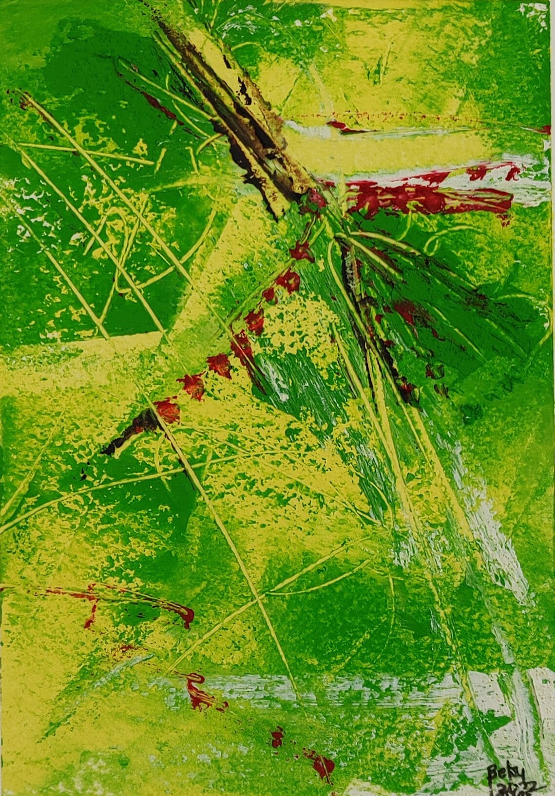 I like to include lots of textures in my paintings. I use several tools in my painting, including squeegees, chop sticks, palette knives, corrugated cardboard and other mark making items.