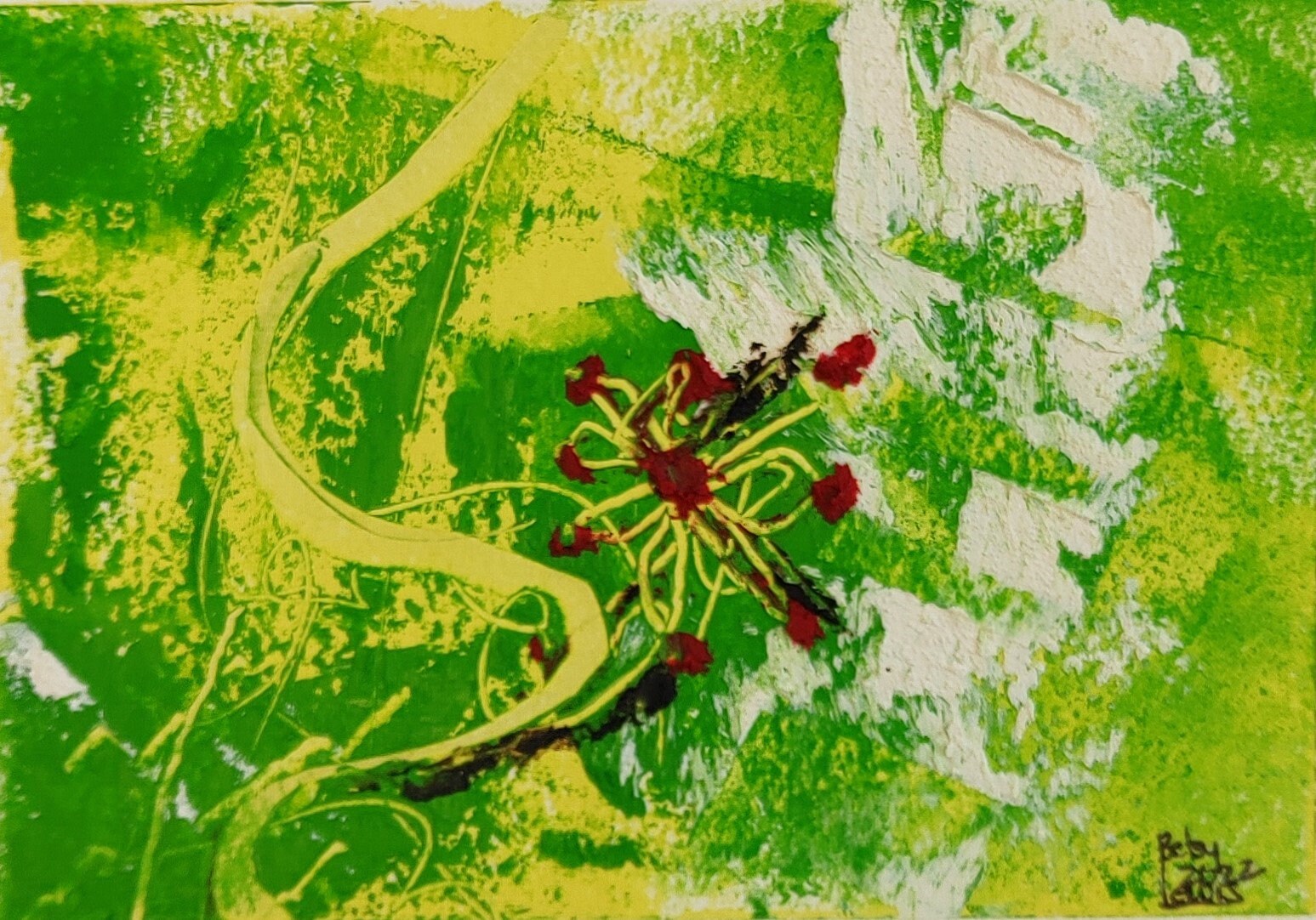 I like to include lots of textures in my paintings. I use several tools in my painting, including squeegees, chop sticks, palette knives, corrugated cardboard and other mark making items.
