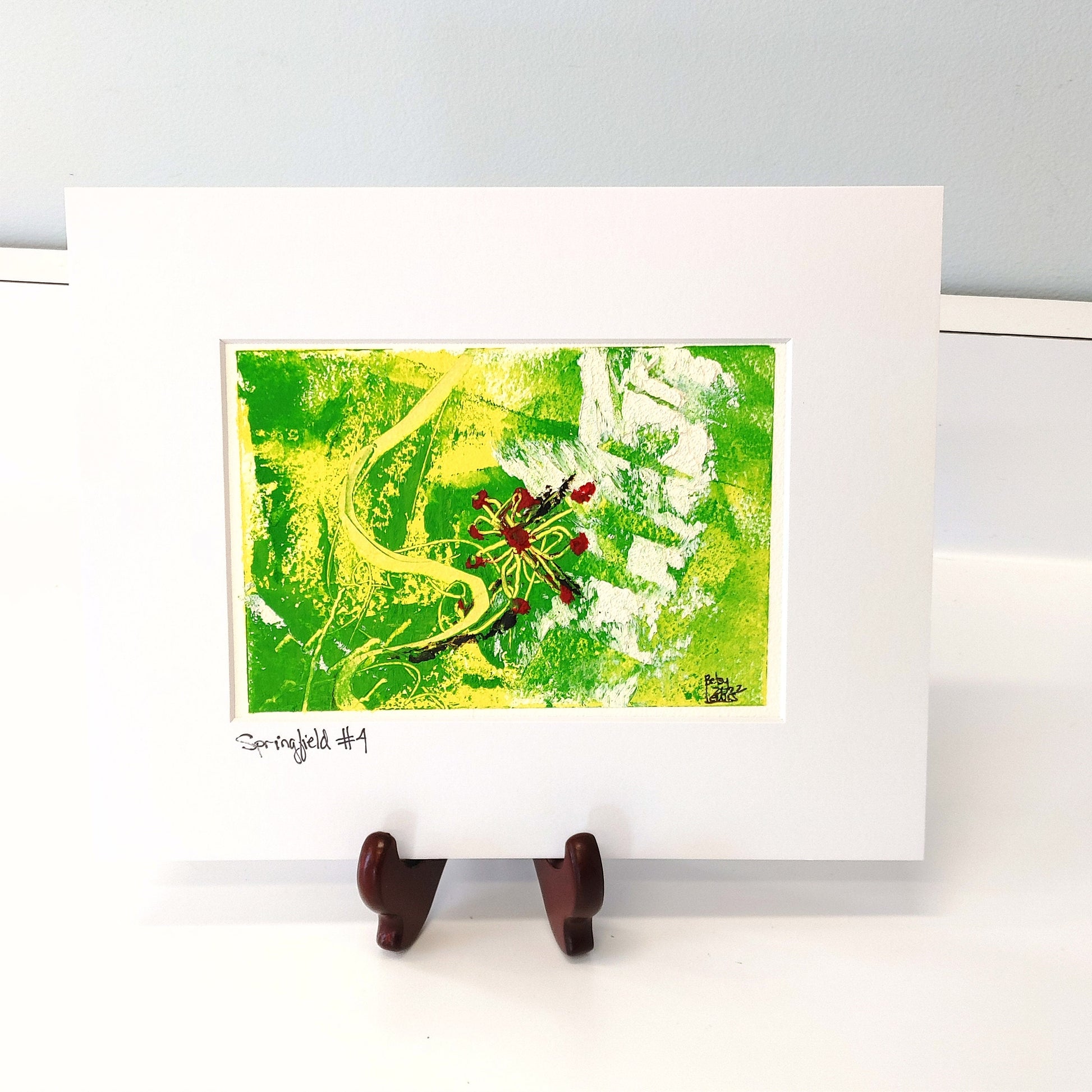 Springfield #4 is an original oil and cold wax painting. The painting itself is approximately 5" x 7" but it is matted in a white mat to 8" x 10" making it just right for a traditional frame. The painting has beautiful rich colors and textures.