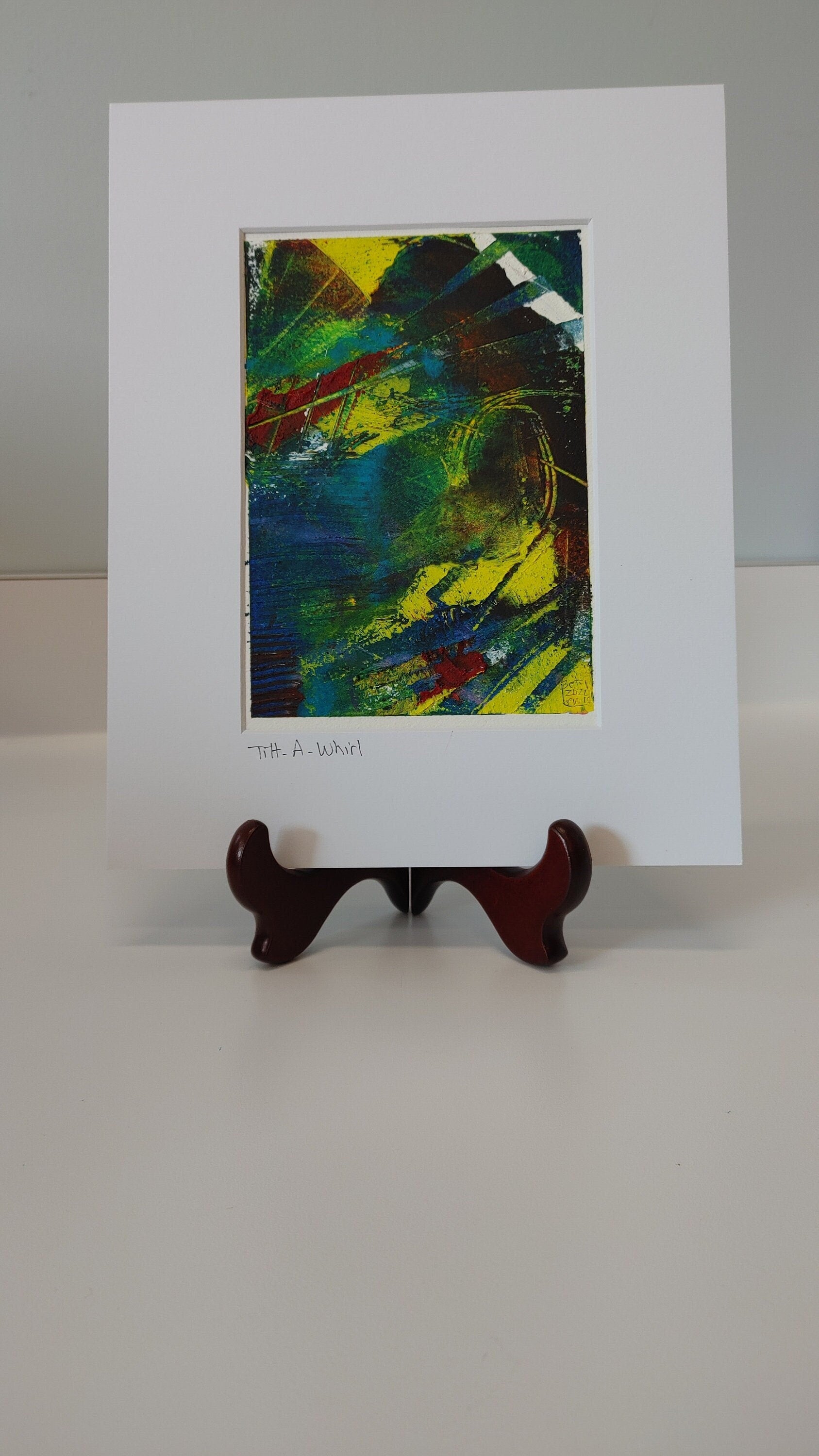 Tilt-A-Whirl is an original oil and cold wax painting. The painting itself is approximately 5" x 7" but it is matted in a white mat to 8" x 10" making it just right for a traditional frame. The painting has beautiful rich colors and textures.