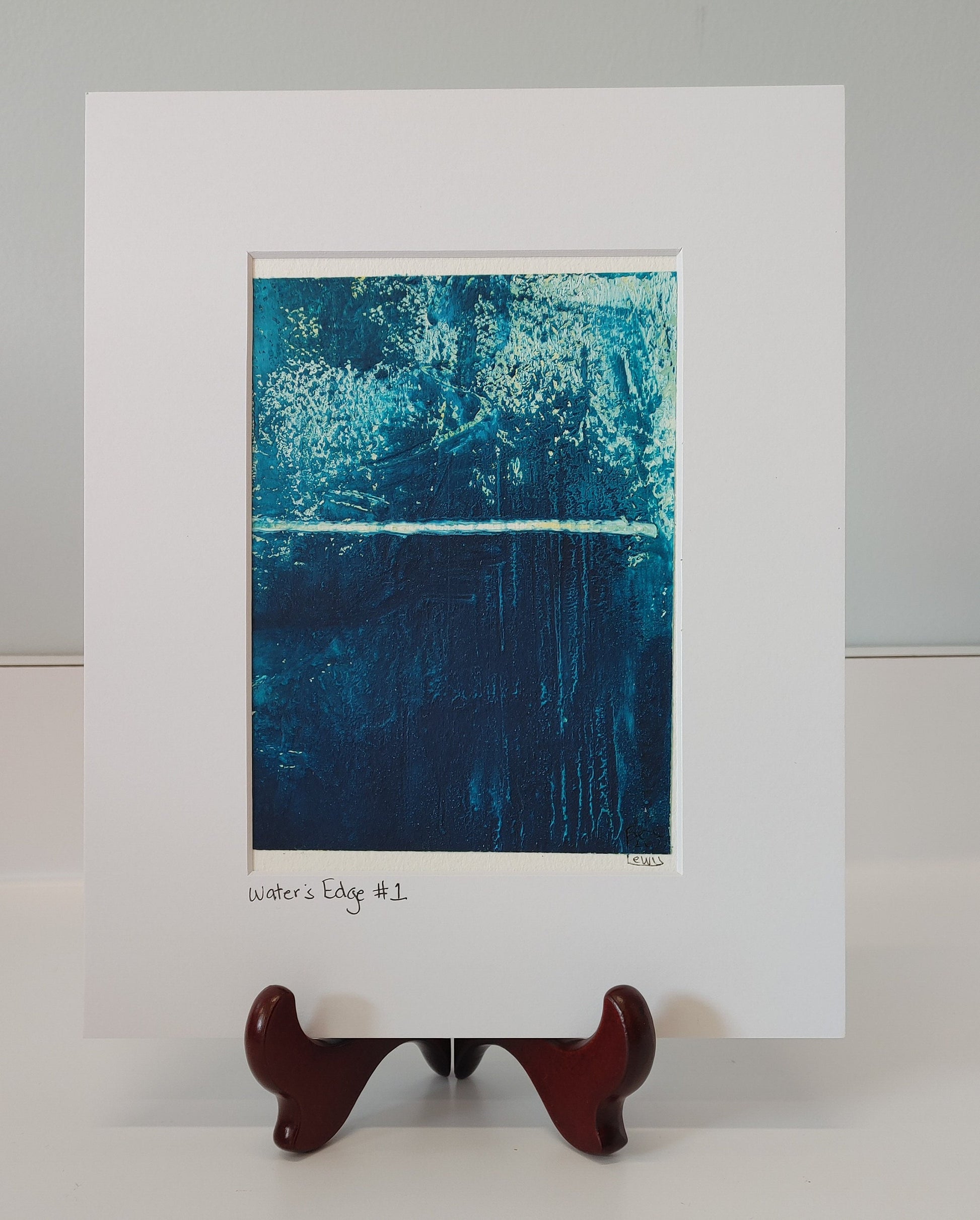 Water's Edge #1 is an original oil and cold wax painting. The painting itself is approximately 5" x 7" but it is matted in a white mat to 8" x 10" making it just right for a traditional frame. The painting has beautiful rich colors and textures.